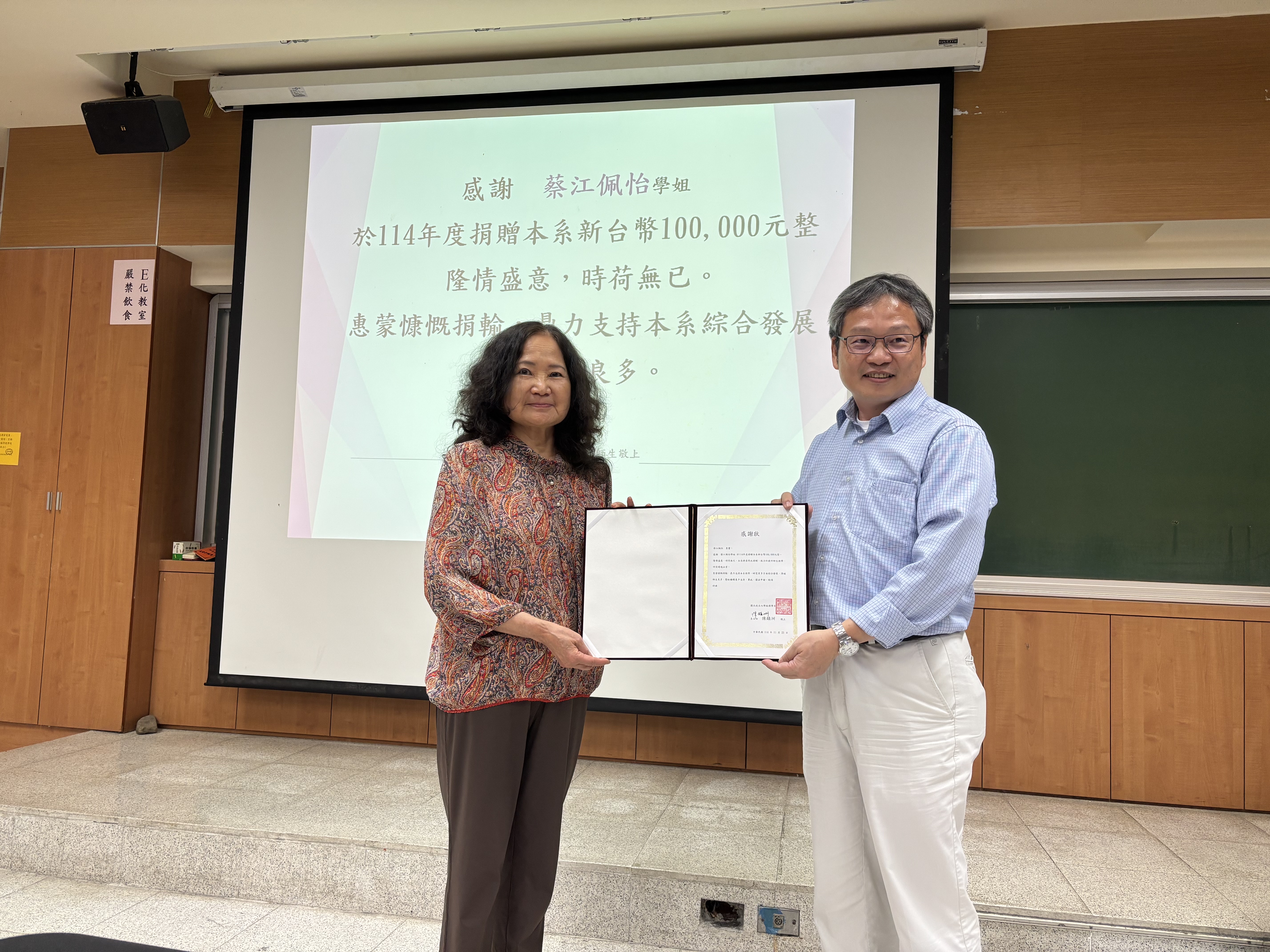 本系第三屆傑出系友、現居美國的房地產專家蔡江佩怡學姊,日前受邀返校與師生進行一場充滿啟發的生命經驗分享會,同時慷慨捐贈母系新臺幣10萬元。